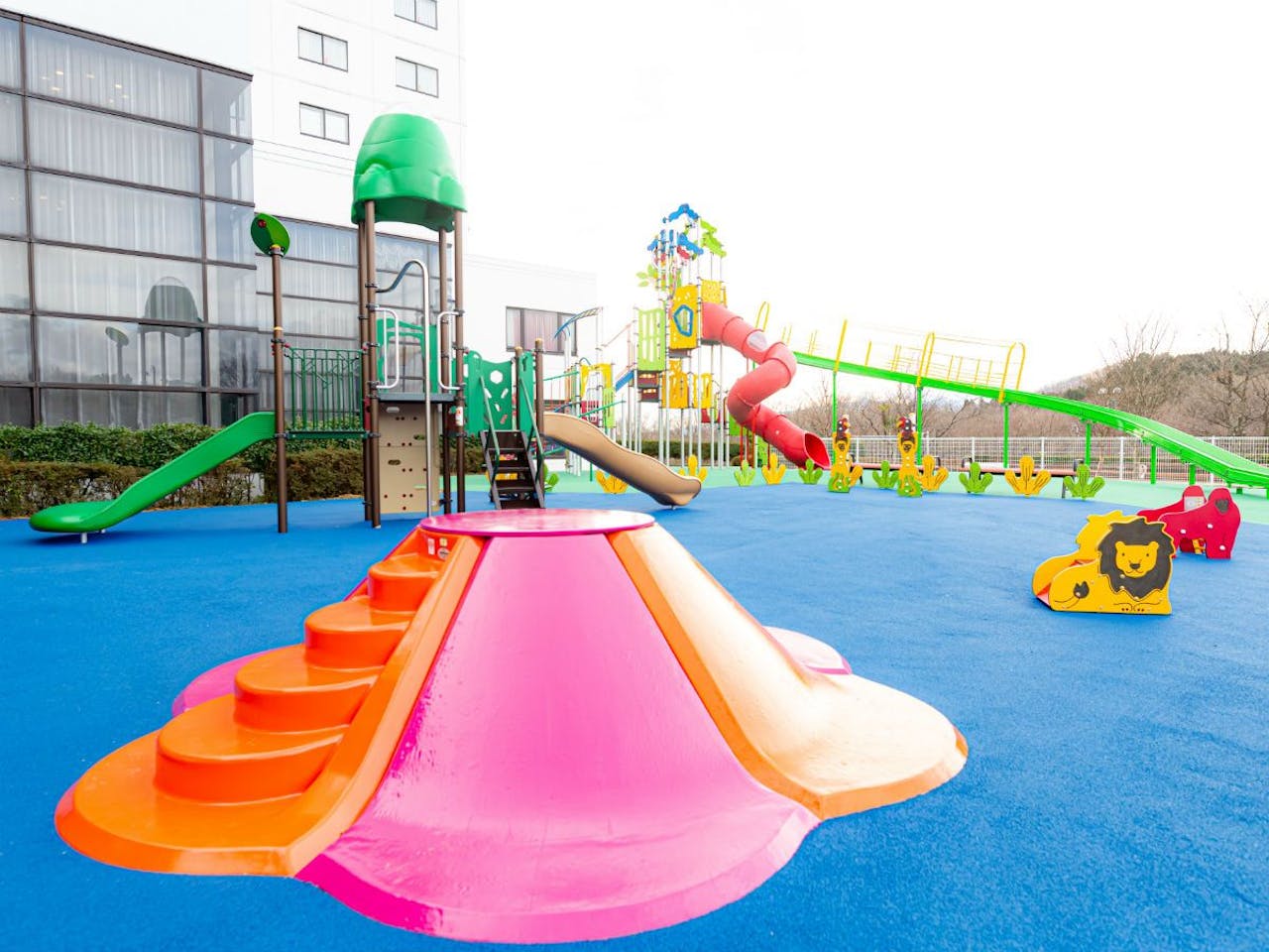 那須塩原駅より無料送迎バスで30分、りんどう湖ファミリー牧場まで徒歩9分の立地に佇む「ロイヤルホテル 那須 -DAIWA ROYAL HOTEL-」は、3か所のベビー&キッズコーナーと屋外キッズパークを備えるリゾートホテル。最上階のビュッフェレストランでは、キッズバイキングや離乳食も提供しています。