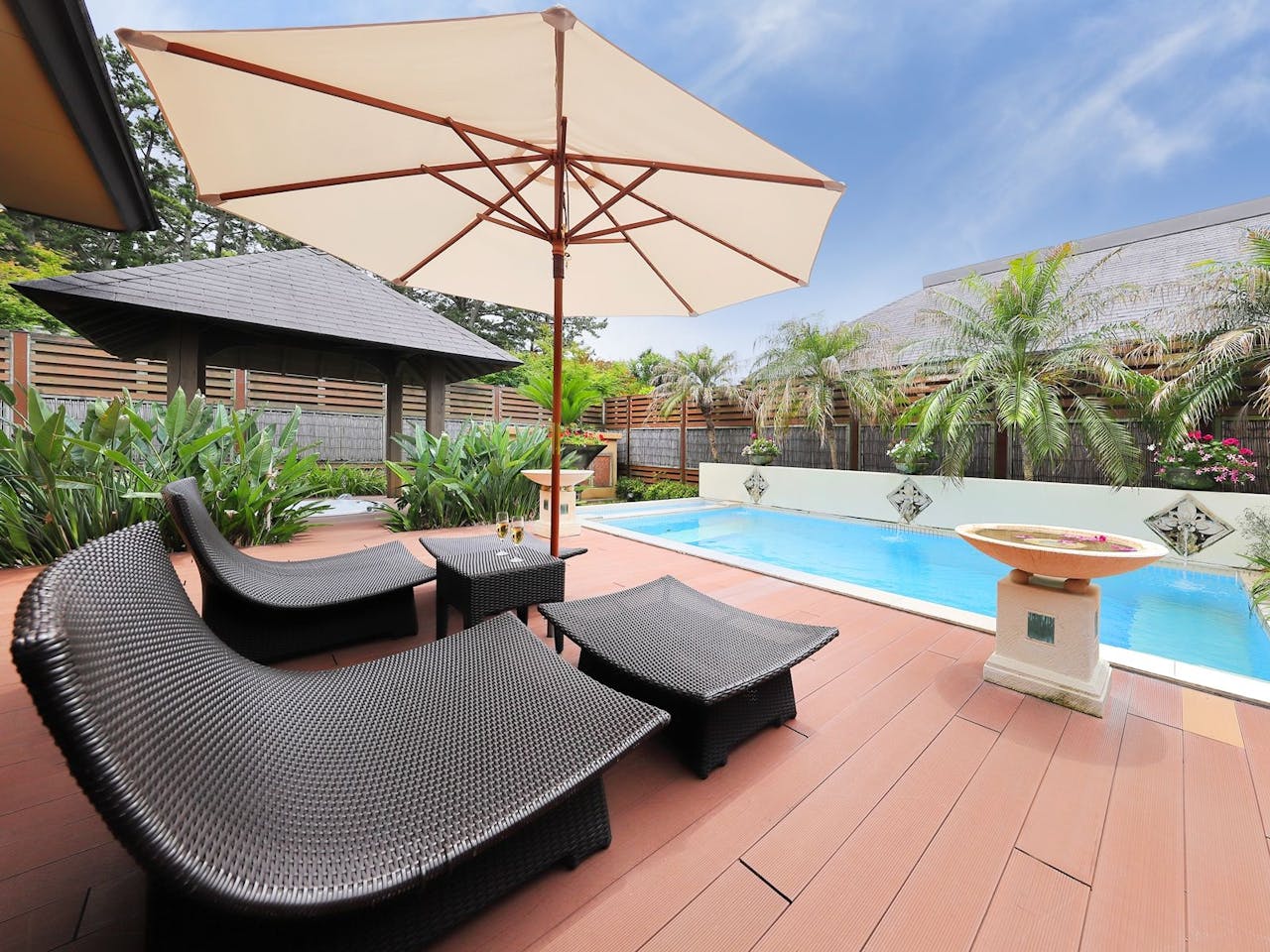 千葉県鴨川市にある「鴨川館別邸 ラ・松廬」は、一棟建てのゲストルームに専用ブロアバスなど、大人の休日を満喫する設備が充実している宿。自慢のエステサロン「ジュニパー」では、カウンセリングから施術まで担うプロのプラクティショナーが、美と癒しのメニューを提供しています。3月から加温される専用プールで、バカンス気分を味わうのもおすすめです。
