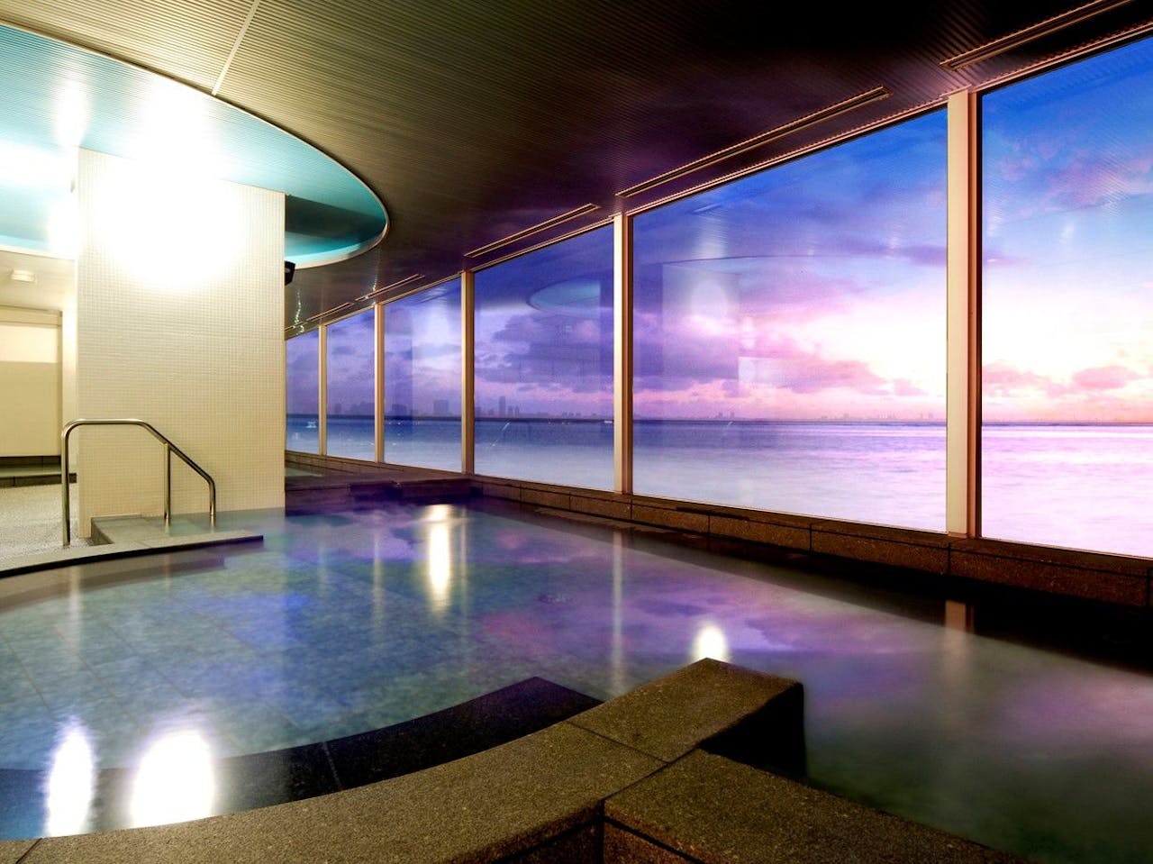 舞浜駅から無料送迎バスで約35分、幕張海浜公園前に佇む「アパホテル&リゾート〈東京ベイ幕張〉」は、総客室数2,700室を誇る日本最大級規模のリゾートホテル。セントラルタワー、イーストウイング、ウエストウイングのそれぞれの棟に、趣向を凝らした大浴場を備えています(イーストウイングの大浴場は女性専用)。