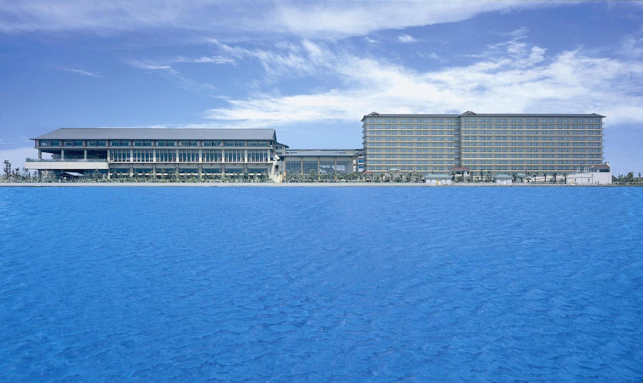 木更津駅から無料送迎バスで約15分の海沿いに佇む「龍宮城スパ・ホテル三日月 龍宮亭」。本館・新館の2つの宿泊棟にスパ専用棟を備え、60種類以上の温泉・スパを堪能できるリゾートホテルです。食事は和洋中60種類以上のメニューをバイキング形式で提供。全室オーシャンビューの客室からは、太平洋を一望できます。