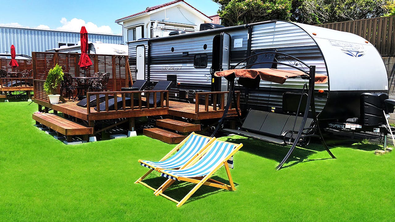 大網駅よりバスで約35分、九十九里・粟生海岸に程近い「Ducale garden hotel 九十九里」は、ビジネスホテルとガーデンホテルに加えて一棟貸しのトレーラーハウス、グランピング施設も備える複合型の宿泊施設。トレーラーハウスはウッドデッキも備え、とれたての九十九里の魚介をBBQで楽しめます。