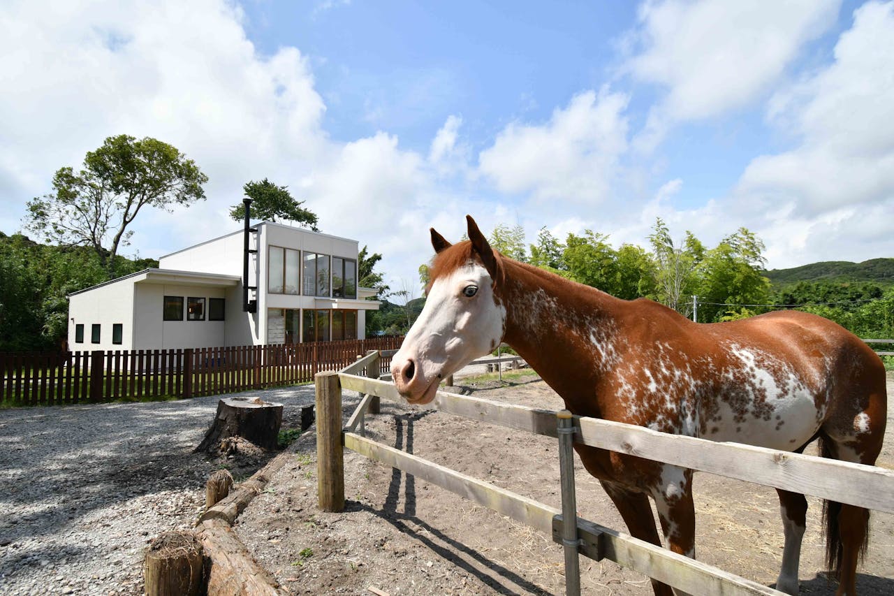 館山自動車道・富浦インターチェンジから車で約20分の高台に佇む「フォレストヴィラ南総の丘」は、一棟建てメゾネットタイプの貸別荘。リビングには薪ストーブを備え、庭ではバーベキューや焚き火台を使った焚き火も楽しめます。客棟前に馬場があり、馬と触れ合えるのも嬉しいポイント。南房総の観光拠点にぴったりです。