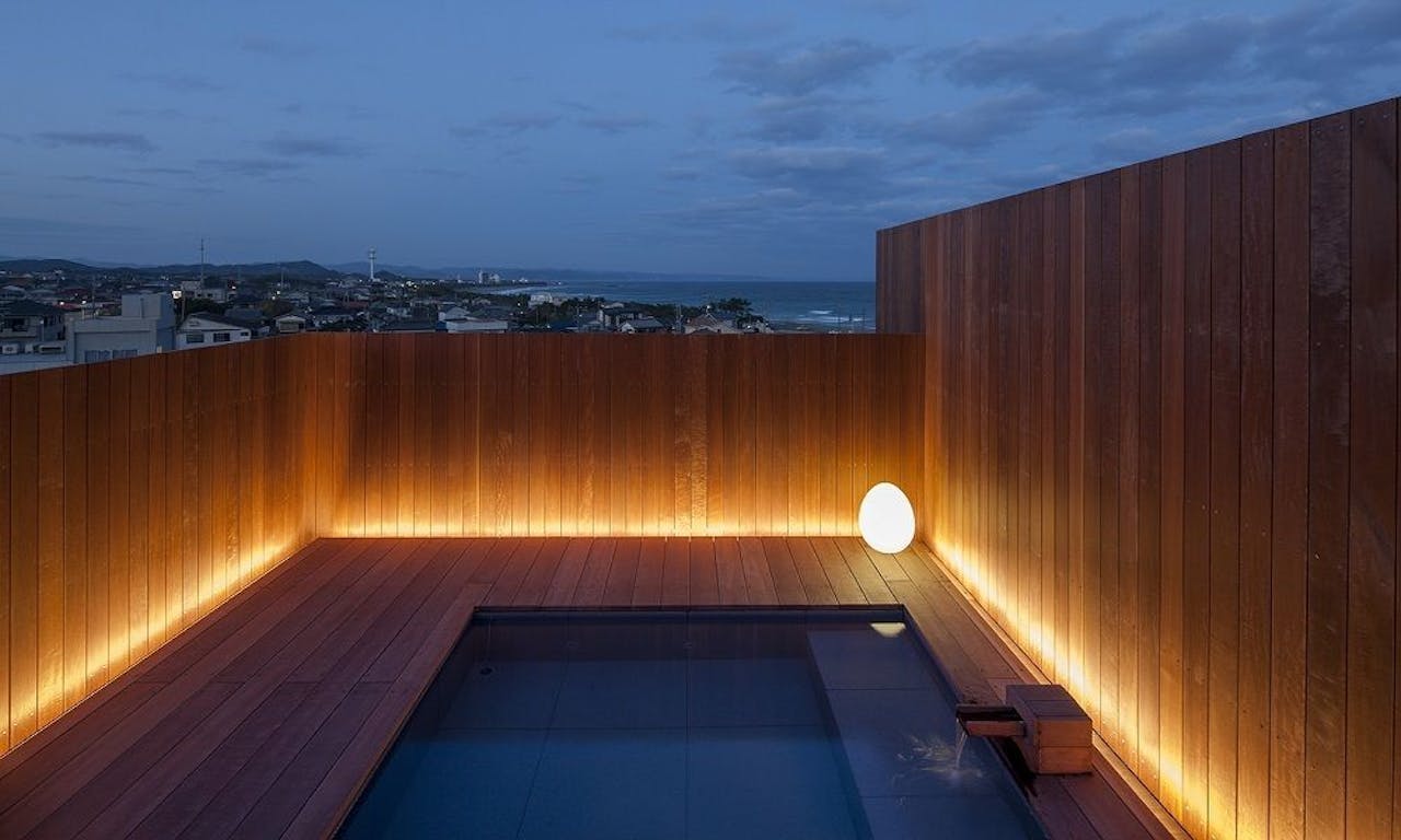 千倉駅より無料送迎車で約3分、南千倉海水浴場に隣接する「千倉温泉千倉館」。南房総の海の幸を使った魚介料理を楽しめる温泉旅館です。貸切風呂は、屋上と中庭に面した2箇所に備え、1回40分2,700円で利用できます。遠浅の海岸までは、宿の中庭を抜けてすぐ。休日をのんびりと過ごしたい人におすすめです。