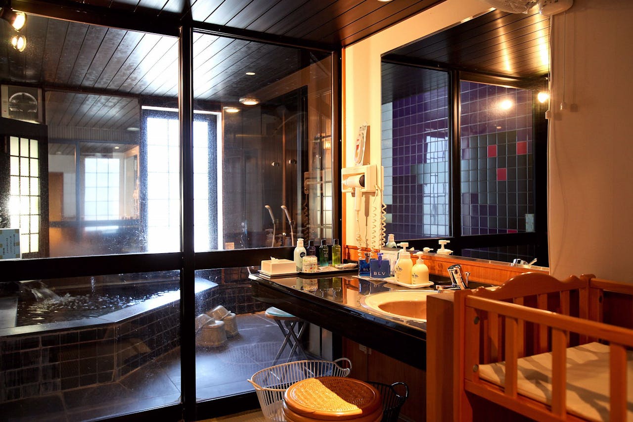 館山駅から車で約25分、野島埼灯台に程近い「赤ちゃん・妊婦さんにも優しいおもてなし 季粋の宿 紋屋」は、部屋から眺める房総の海と新鮮な魚介を使った創作料理が自慢の温泉旅館。2箇所の貸切風呂は、1回50分2,200円で利用できます。予約不要・無料の家族風呂は、バリアフリー対応でファミリーにうってつけ。