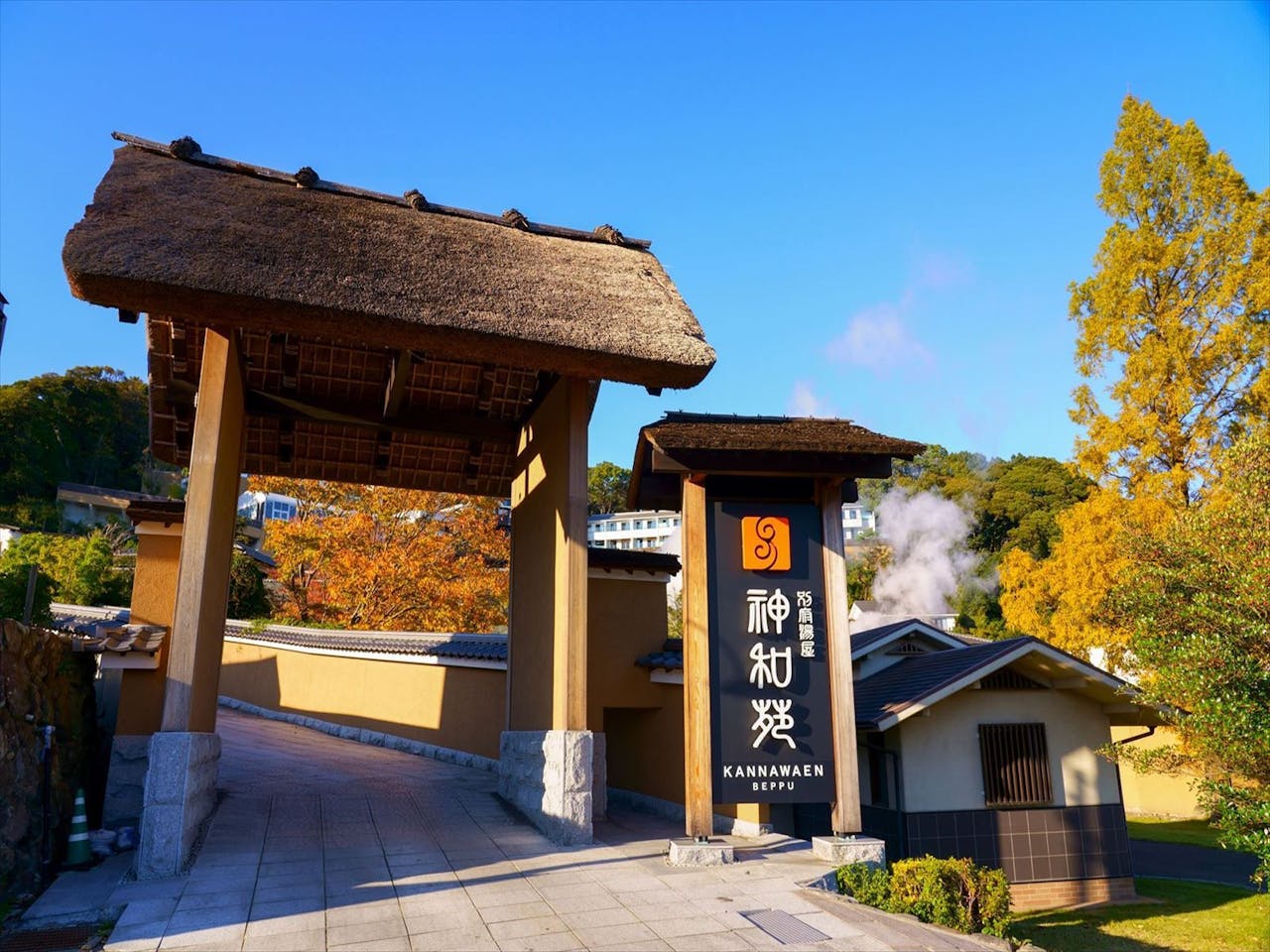 JR別府駅より車で約20分、趣ある門の先に佇む「山荘 神和苑」。2つの自家源泉を所有し、加水・加温なしの天然温泉を心ゆくまで堪能できる温泉宿です。大浴場に加え、全客室の風呂も源泉かけ流し。敷地内でも高台にある宙館の大浴場では、市街地の向こうに広がる別府湾などの夜景を望みながら温泉を楽しめます。
