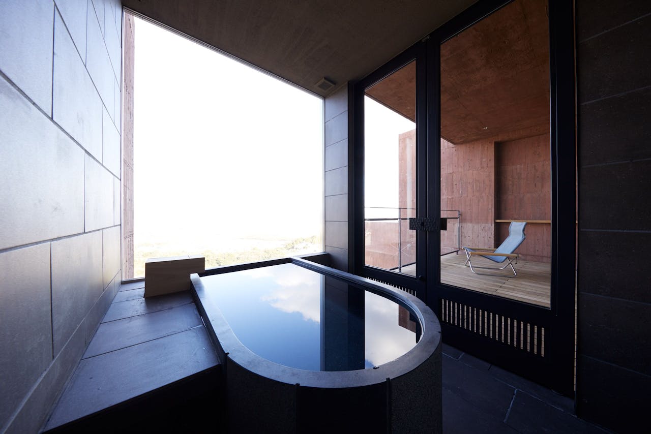 JR別府駅から車で約15分、別府湾に面した「AMANE RESORT GAHAMA(ガハマテラス)」。ヴィラ・メゾネット・タワー棟の7タイプ(31室)の客室は、71平米以上の広々とした空間です。全室に源泉掛け流しのビューバスが付いており、海や庭を眺めながらプライベート空間で温泉が楽しめます。
