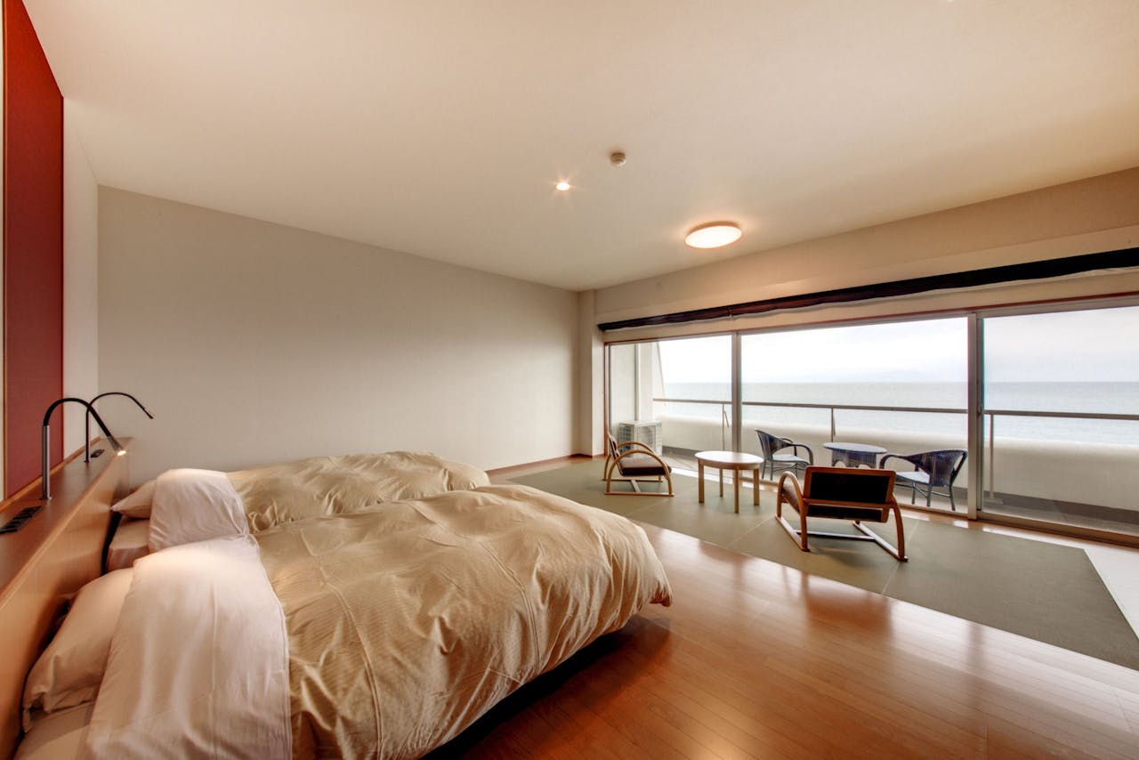 おすすめのプランは「基本宿泊プラン【指宿スタンダード】いぶすきたまて箱 × ハーフビュッフェ オーシャンビュー和洋室 ベランダ付タイプ(禁煙)」、25,650円~(2名、夕朝食付)。