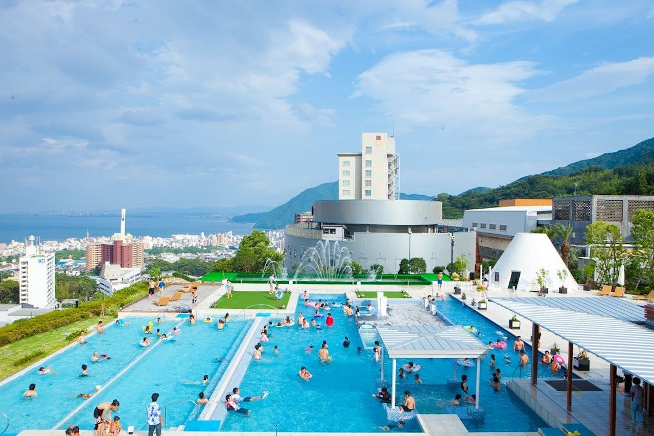 別府駅から車で約10分、別府八湯の一つ観海寺温泉の高台に佇む「杉乃井ホテル」は、棚田状の大展望露天風呂や水着で遊べる屋外の温泉施設が人気の温泉リゾート。本館・中館・新館からなり、バラエティ豊かな客室タイプが揃います。食事は海と山の旬食材を使用した料理をバイキングで提供。