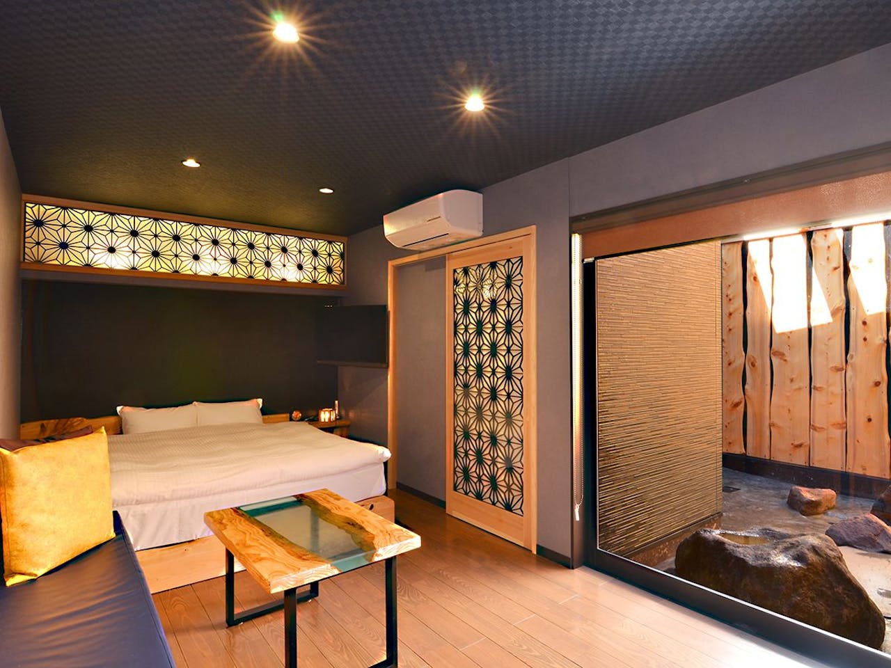 大分県別府市にある「日本旅館 器 別府鉄輪」は、貸切露天風呂が人気の本館と離れ客室で構成される宿。離れ客室は内湯に加え、源泉かけ流しの露天岩風呂がついています。組子文様があしらわれた室内は、茶人・千利休の世界観を彷彿とさせる空間。10帖のリビング・寝室を含め、プライベートを満喫する旅にぴったりです。