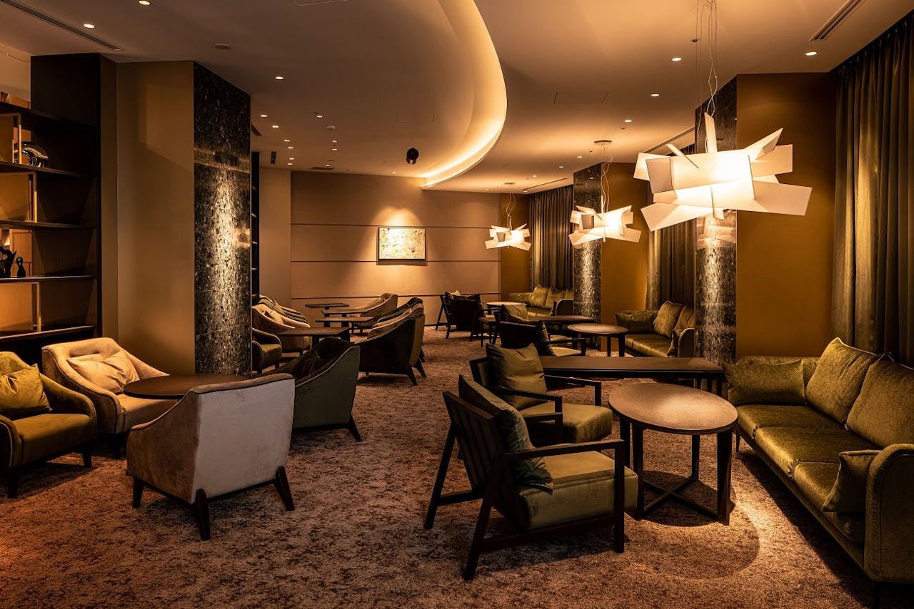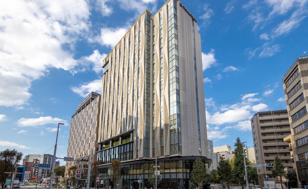JR博多駅から徒歩約7分の場所にある、博多織の文様をモチーフにした外観が特徴の「THE BLOSSOM HAKATA Premier(ザ ブラッサム博多プレミア)」。最上階のクラブフロアの13室の客室は、和を基調とした落ち着ける空間。専用のラウンジでは、厳選された日本酒やワインを楽しめます。