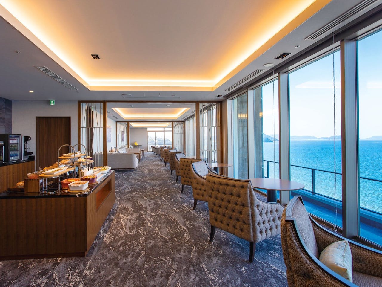 JR東唐津駅から車で3分の場所にある「唐津シーサイドホテル」。オーシャンフロントのこの宿では、客室や大浴場、レストランなど館内の至るところから雄大な唐津湾を一望できます。最上階の専用ラウンジで海を眺めながらの優雅なティータイムも、クラブフロア宿泊者ならではの贅沢な時間です。