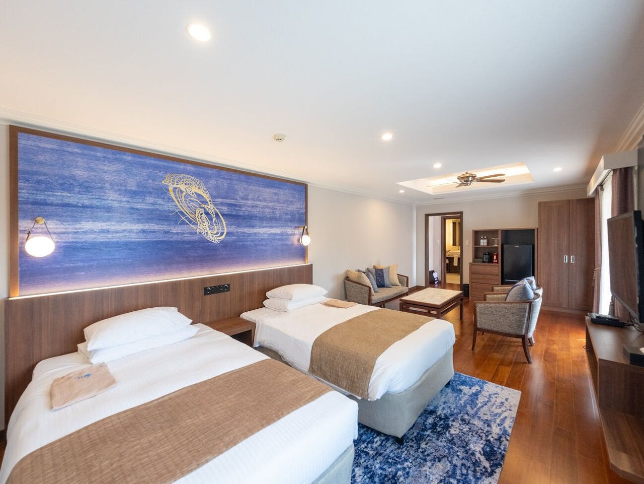 | 共通アメニティ | シャンプー・リンス ボディソープ・石鹸 タオル・バスタオル ボディタオル・スポンジ ハミガキセット くし・ブラシ シャワーキャップ ドライヤー 髭剃り シェービングジェル・フォーム 入浴剤 ナイトウェア バスローブ スリッパ 綿棒 コットン 冷蔵庫 ミニバー 湯沸しポット お茶セット(無料) テレビ 金庫 衛星放送 ビデオ・オン・デマンド Blu-rayプレイヤー ポータブルオーディオ用スピーカー 客室備付PC・タブレット端末 |