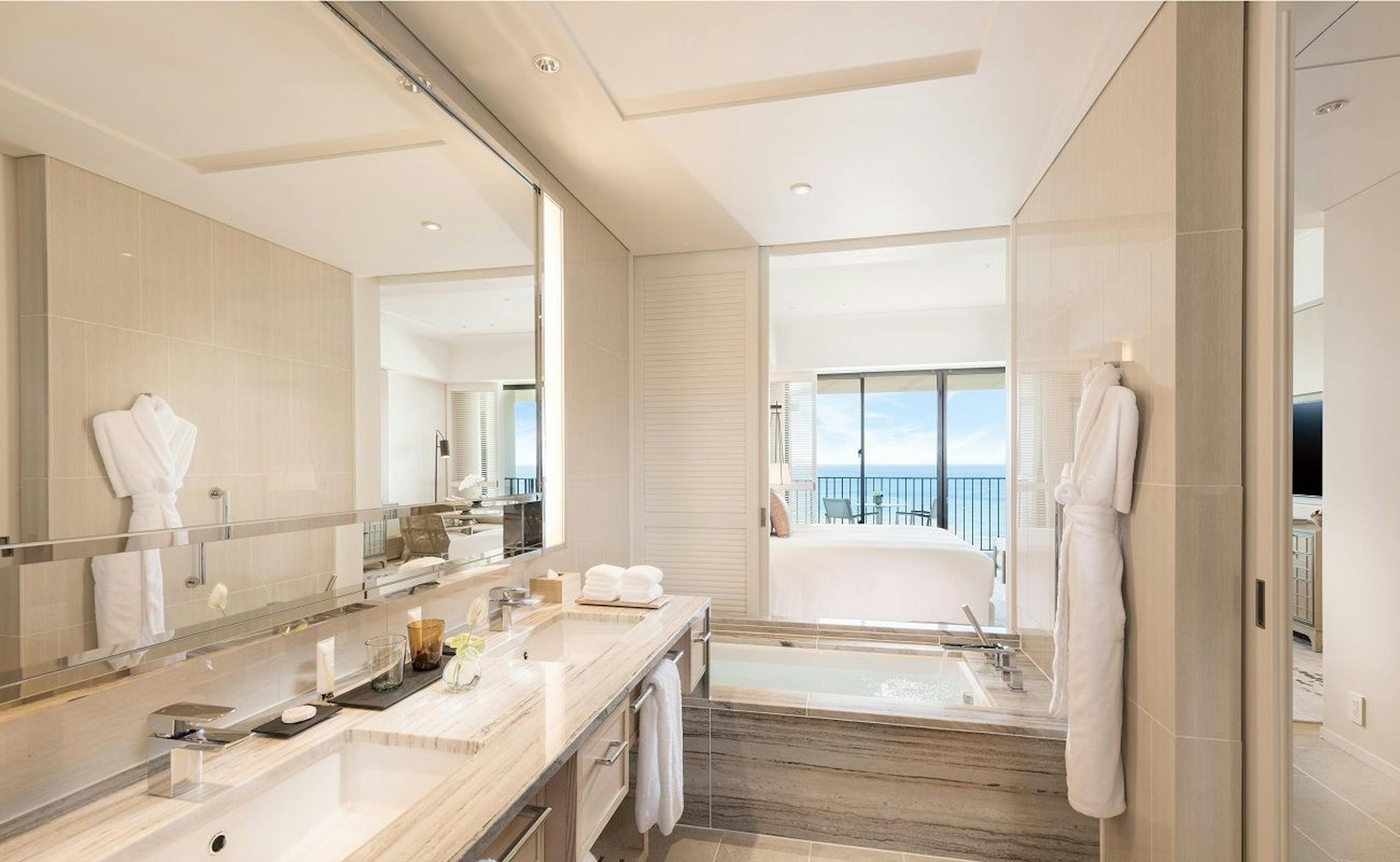 那覇空港から車で75分、恩納村の海岸沿いに広がる「ハレクラニ沖縄」。ハレクラニとはハワイの言葉で「天国にふさわしい館」を意味します。客室は全室オーシャンビュー、テラス付きの白を基調としたラグジュアリーな空間。ハワイで100年以上の歴史をもつホテルならではのホスピタリティも魅力です。