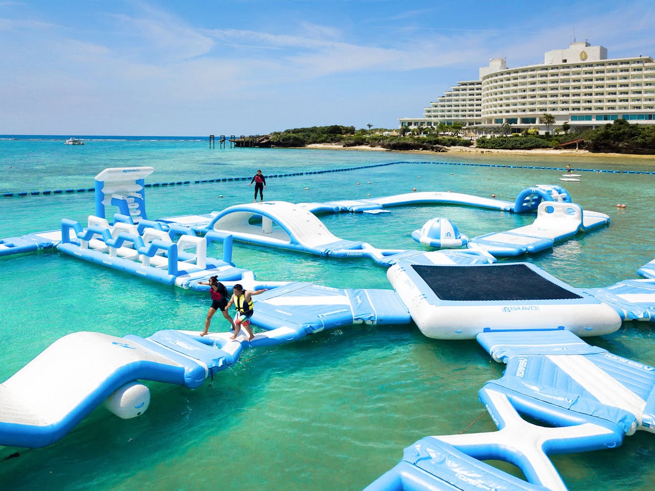 那覇空港から空港リムジンバスで約100分、三方を海に囲まれた立地に佇む「ANAインターコンチネンタル万座ビーチリゾート」。40種類以上のアクティビティや海上アスレチックを楽しめるリゾートホテルです。敷地内のビーチはプライベート感満載。キッズ向けにはスタンプラリーや砂遊び用品の貸出も行っています。
