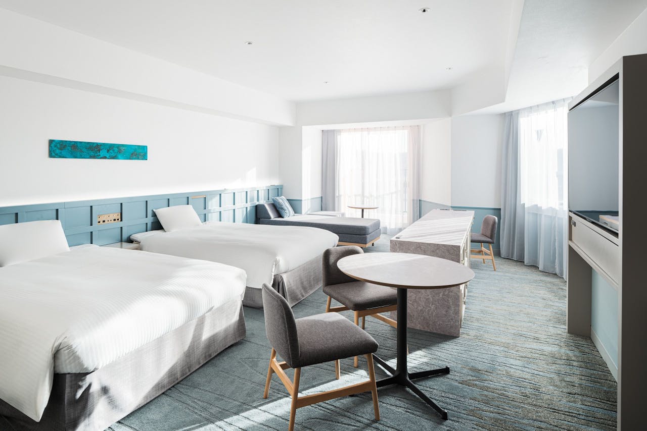 那覇空港から車で約40分、商業施設デポアイランド内に佇む「レクー沖縄北谷スパ&リゾート」。沖縄では珍しい天然温泉の大浴場を備えるリゾートホテルです。約100種類のメニューが並ぶ朝食ブッフェは5歳以下無料。ベビーカーや紙おむつなど、無料貸出のベビー&キッズアメニティも充実しています。