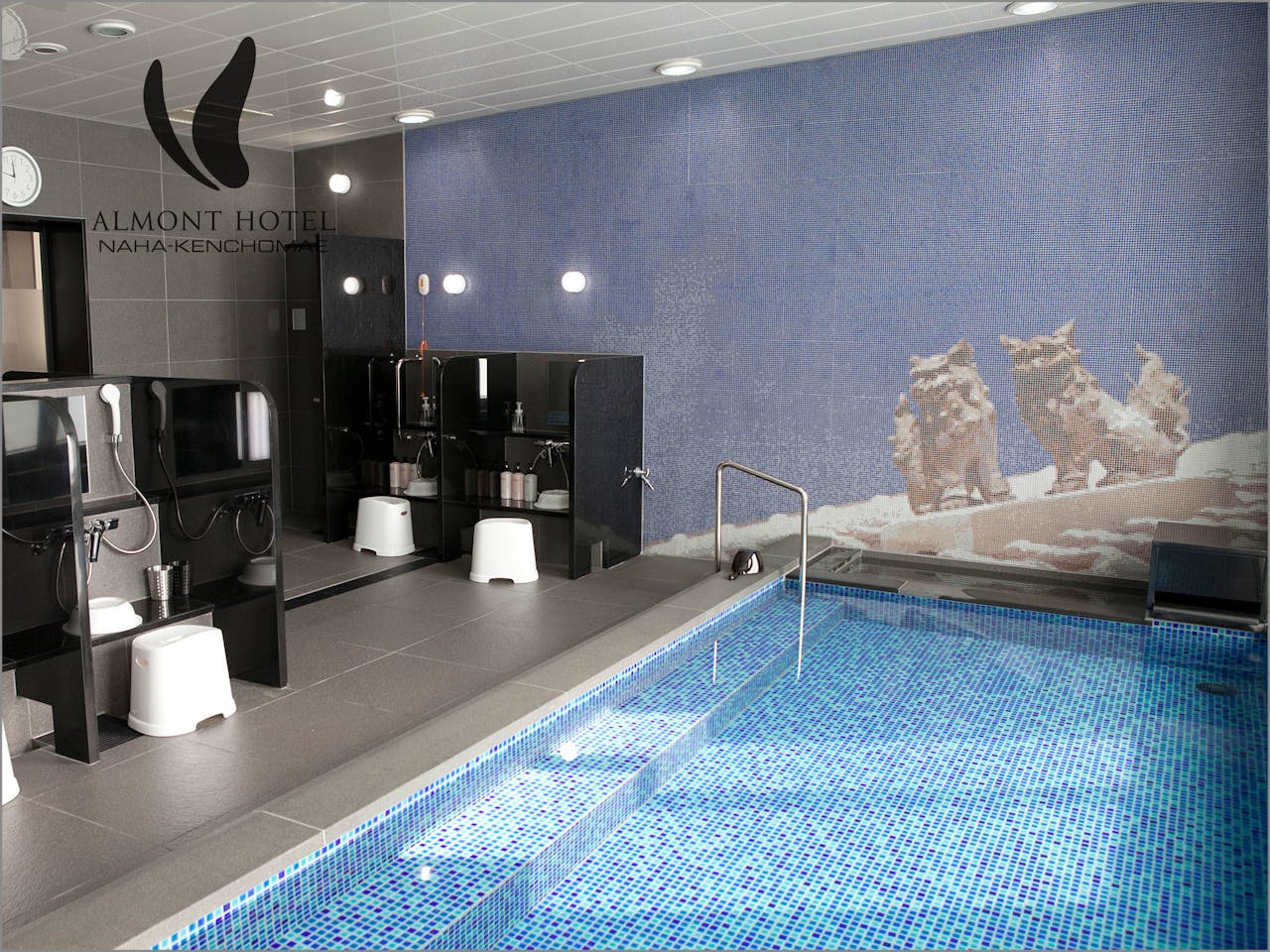 ゆいレール・県庁前駅から徒歩約3分の市街地に建つ「アルモントホテル那覇県庁前」。駅が近く、国際通りまで徒歩圏内にあり、観光にもビジネスにも利便性の高いホテルです。シーサーのデザインが印象的な人工温泉の光明石温泉浴場は、深夜2:00まで利用できます。