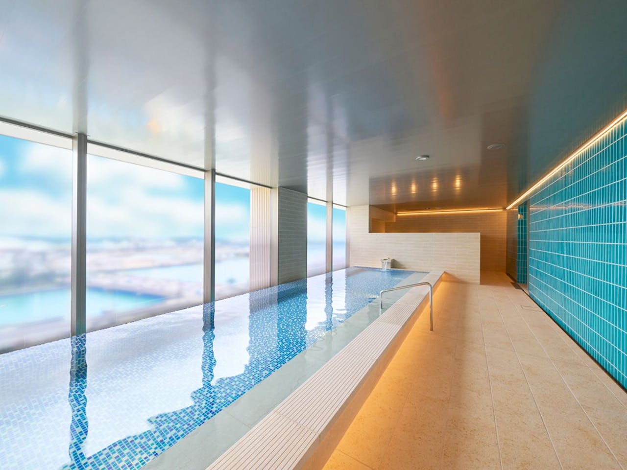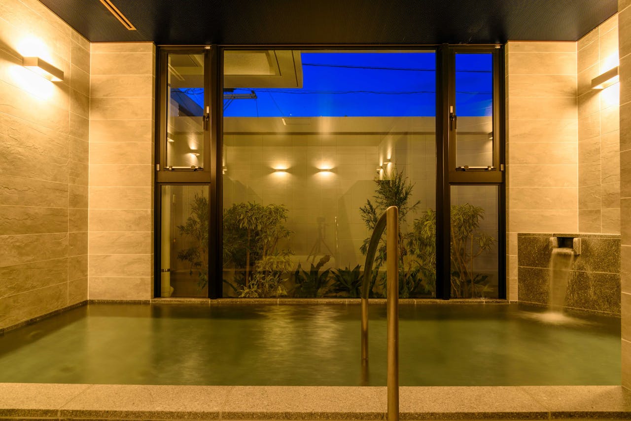 2022年4月にオープンしたばかりの「ホテルリソルトリニティ那覇」は、ゆいレール・旭橋駅から徒歩約3分、那覇空港からは車で約10分とアクセス抜群の立地が魅力のホテルです。最上階にある人工温泉の大浴場は、大窓が設けられ明るく開放的。湯上りスペースには本もあり、読書をしながら寛ぐこともできます。