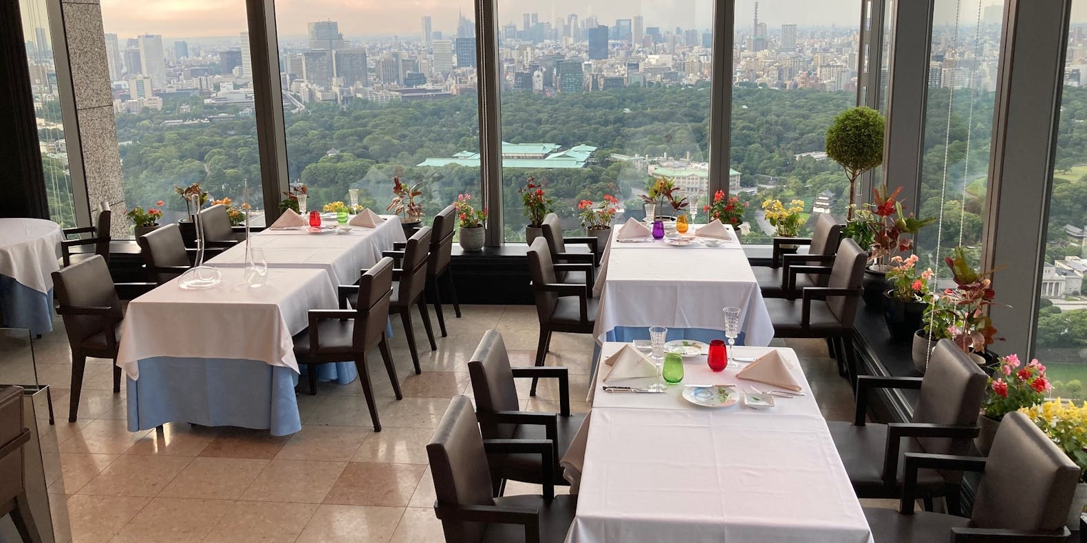 「レストラン・モナリザ 丸の内」は、JR東京駅から徒歩2分の丸ビル最上階に位置するフレンチレストラン。旬食材を使用した料理は、味はもちろん盛り付けも絵画のような美しさと好評です。昼間は間近に皇居や国会議事堂、天気が良ければ富士山も展望できます。