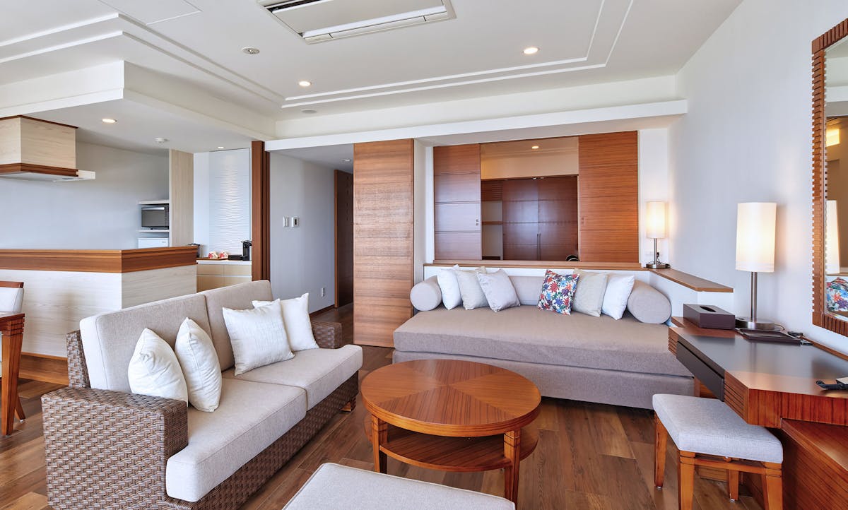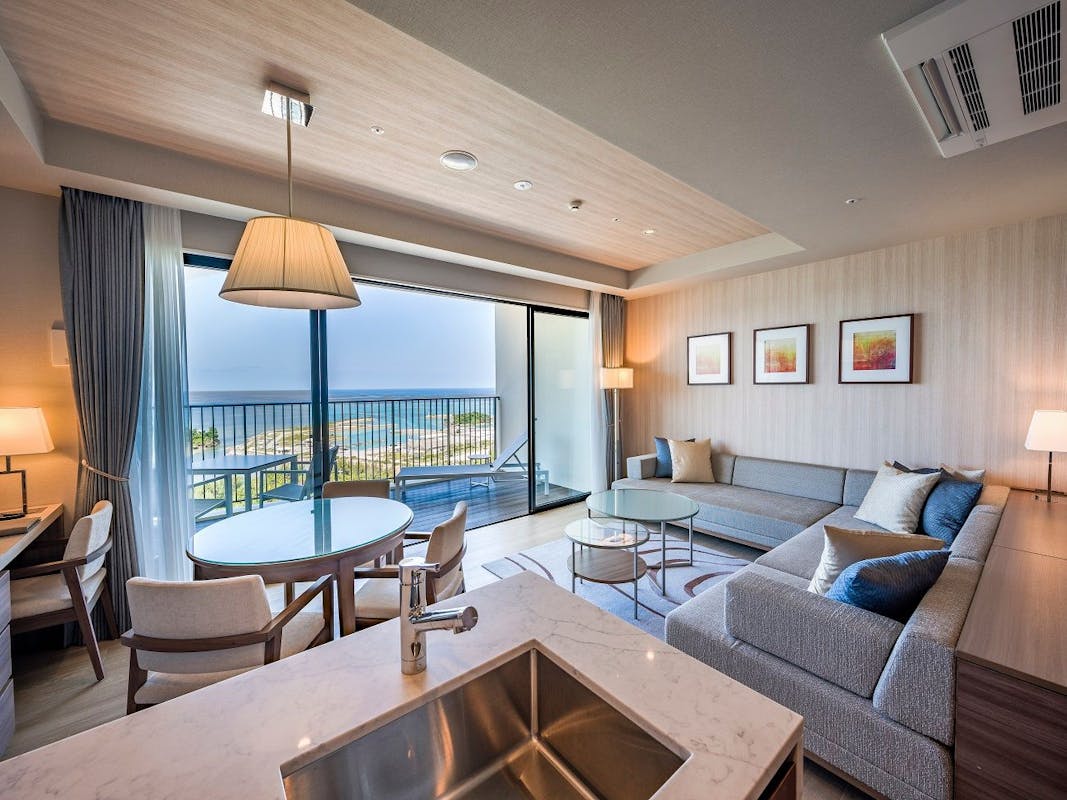 沖縄県国頭郡恩納村にある「カフー リゾート フチャク コンド・ホテル」は、観光スポットの中心地に佇む全室オーシャンビューのホテル。各部屋が独立したスイートルームスタイル(一部、リビングルームなし)で、ほとんどの客室にはキッチンが備っており、長期ステイにもおすすめです。美味しい食事を部屋で楽しめるテイクアウト専門店がホテル内に備わっているのも嬉しいポイント。