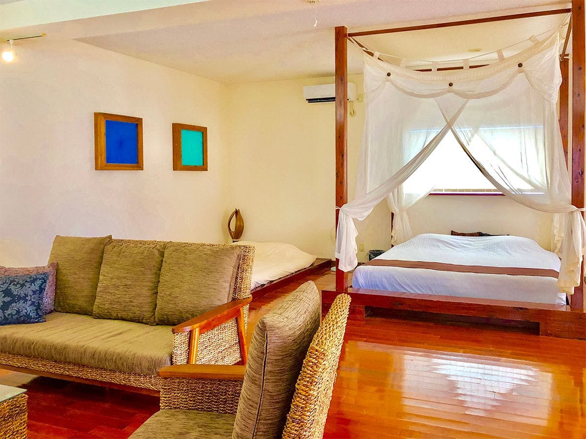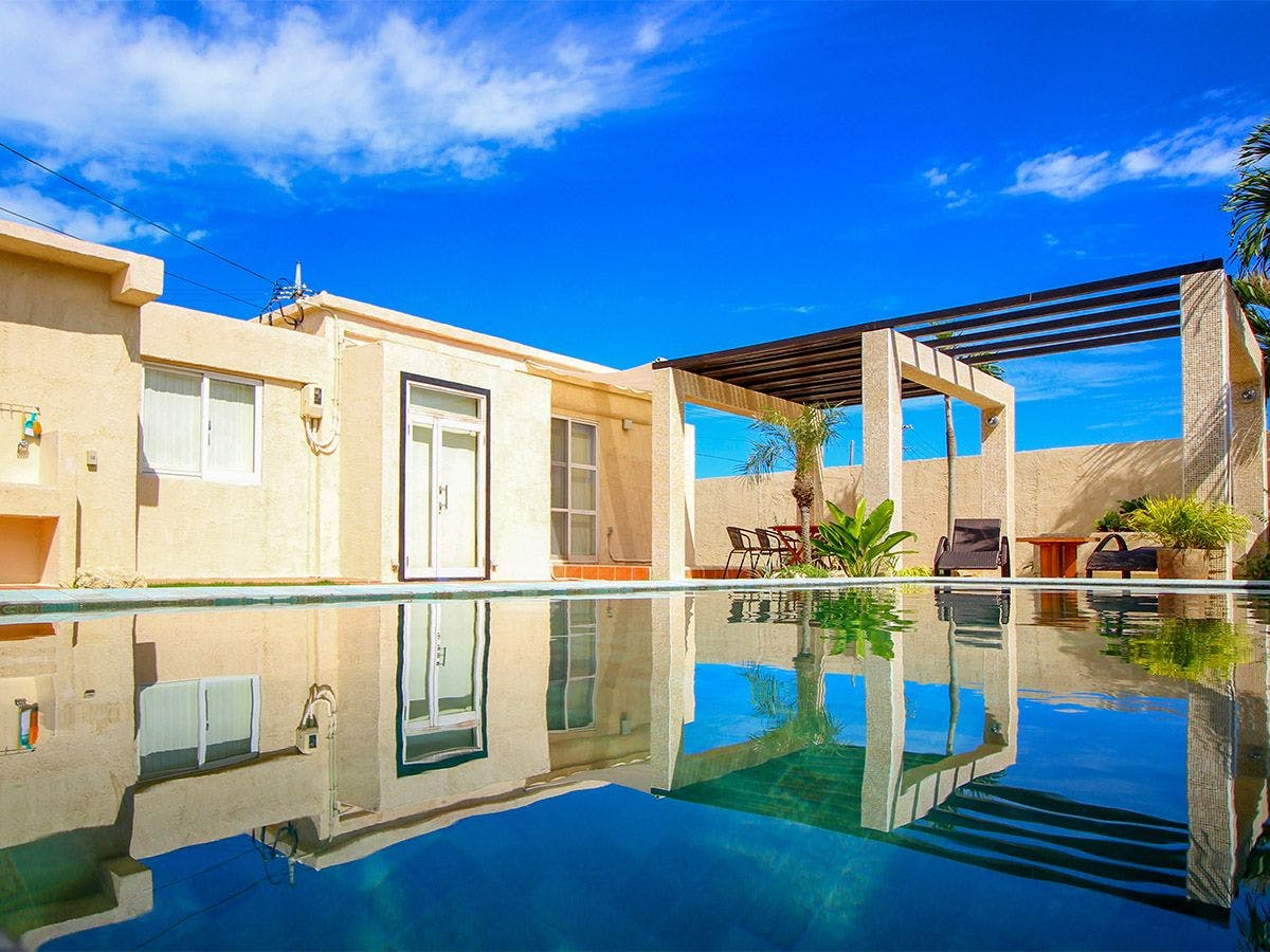 沖縄県宮古島市にある「private house YOSHINO」は、1日1組限定の一棟貸しヴィラ。高い外壁に囲まれたプライベート空間には、プールや露天風呂を完備。キッチンは家電付きで、暮らすようなホテルステイが叶います。沖縄に長期滞在したい時におすすめの宿の一つです。