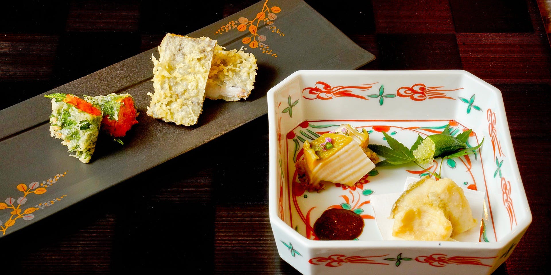 都営浅草線・東京メトロ日比谷線「東銀座駅」から徒歩1分の「天ぷら 銀座おのでら 東銀座店」。食材はもちろん、油や小麦粉までこだわり抜いた天ぷらを専属ソムリエが選定したシャンパンとともに堪能できます。テーブルを華やかに彩る、特注の食器にも注目してみてください。