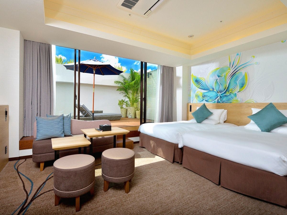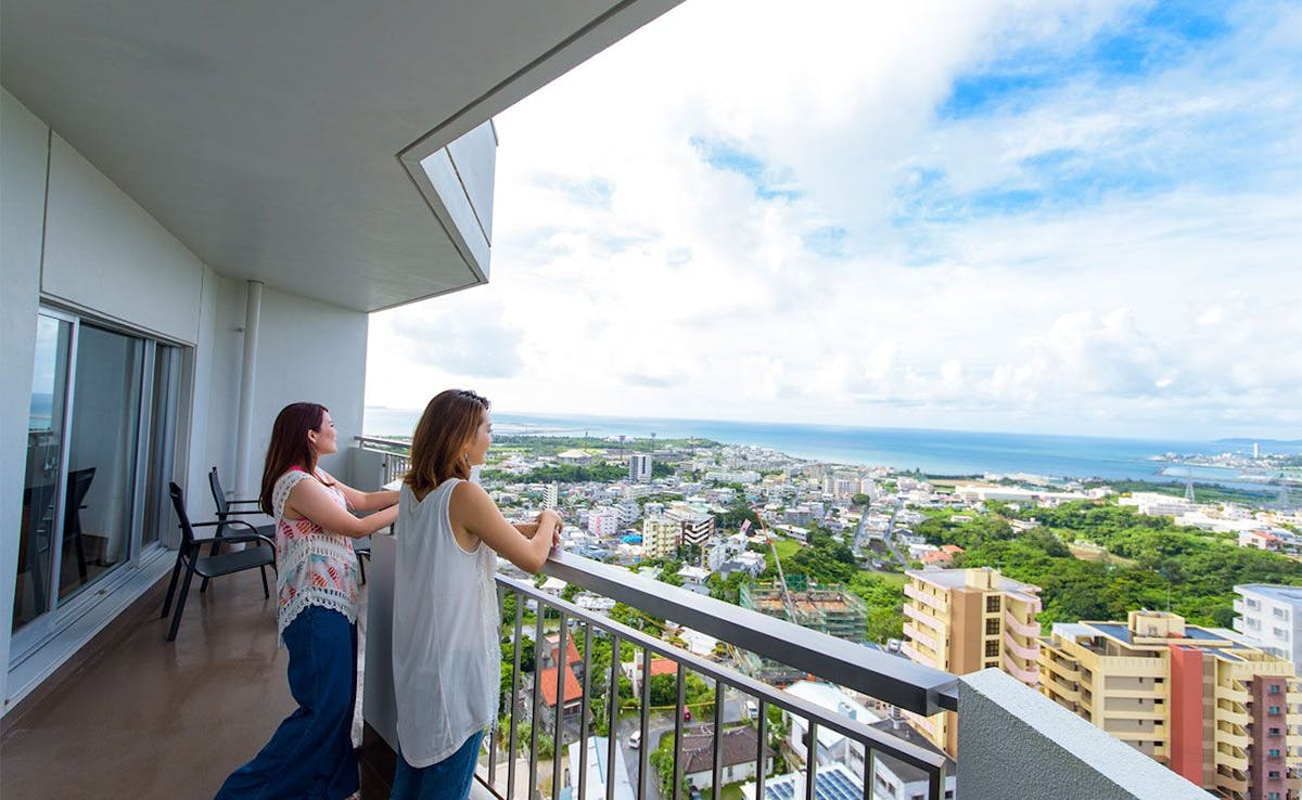 沖縄本島中部、東海岸を望む高台に位置する「オキナワグランメールリゾート」。すべての客室にオーシャンビューテラスが付いており、沖縄市の街並みとその先に広がる東海岸を一望できます。宿泊者が無料で使えるプールやサウナを完備しているのも魅力。