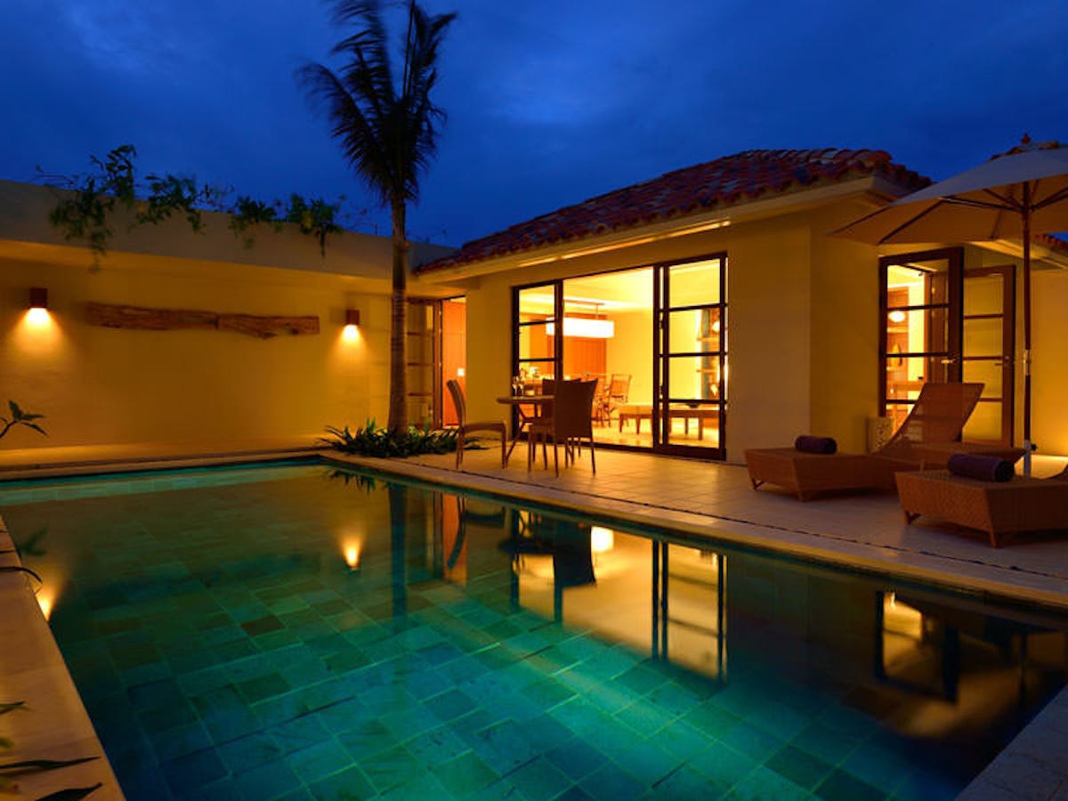 中頭郡読谷村にある「ジ・ウザテラス ビーチクラブヴィラズ」は、全室プール付きのヴィラスタイルクラブリゾート。すべてのヴィラが、プールを囲むようにベッドルームとリビングを配置したプライベート感あふれる空間です。10月から4月の期間限定で温水プライベートプールの客室があるのも嬉しいポイント。レストランでは、フレンチベースのコンチネンタル料理を提供しています。
