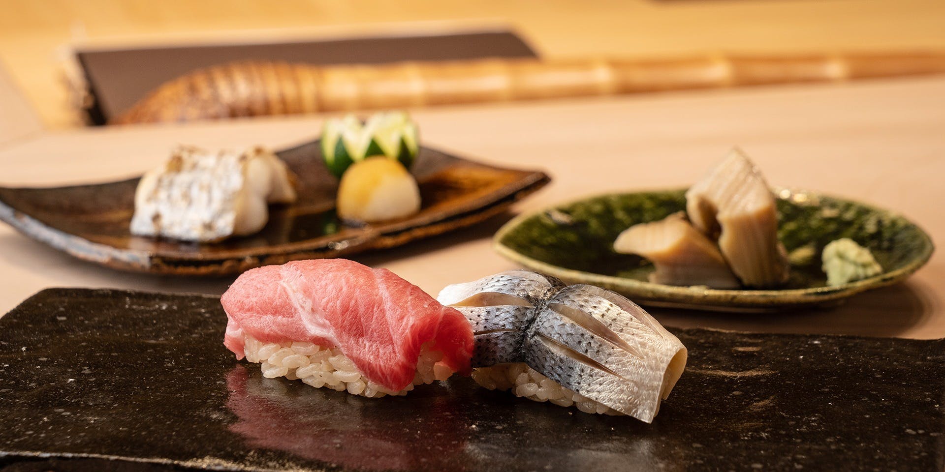 JR「飯田橋駅 」西口から徒歩3分、神楽坂の本多横丁に佇む「鮓家一」。グランド ハイアット東京で長年料理長を務めた店主が腕を振るう寿司専門店です。カウンター8席のみの店内は、気の置けない相手と料理を楽しむのにぴったり。(ネット予約は、空席状況によって予約の可否が確定する仮予約のみ受け付けています)