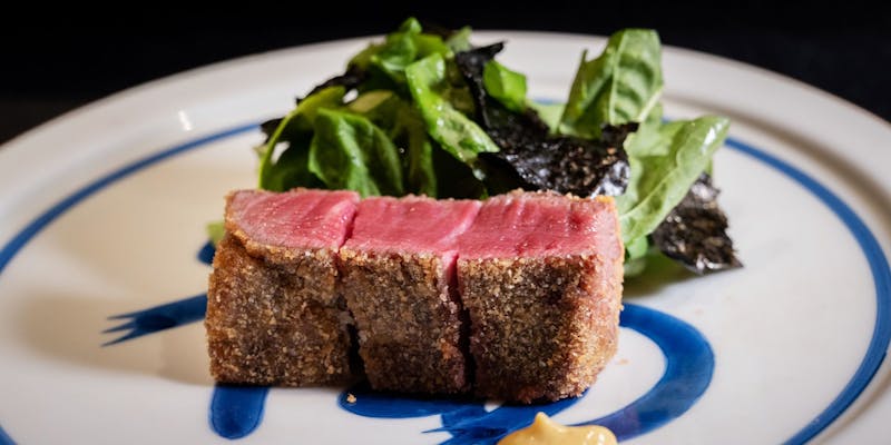 東京メトロ日比谷線六本木駅」から徒歩12分の位置に佇む「常」。神戸にある川岸牧場の和牛などを使った、店主こだわりの本格肉料理が味わえます。口の中でほろりと解け、質の高い甘みが広がる「黒毛和牛タンの塊焼き」が名物。静かで凛とした店内で至極の肉割烹が堪能できます。