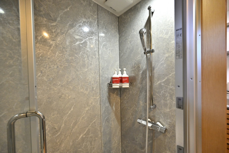 寝る前にはシャワーブースでシャワーを浴びてから、全自動でお湯張りができる半露天風呂を満喫(囲いをすべて閉めても、夜空の星が見えるレイアウトです)。