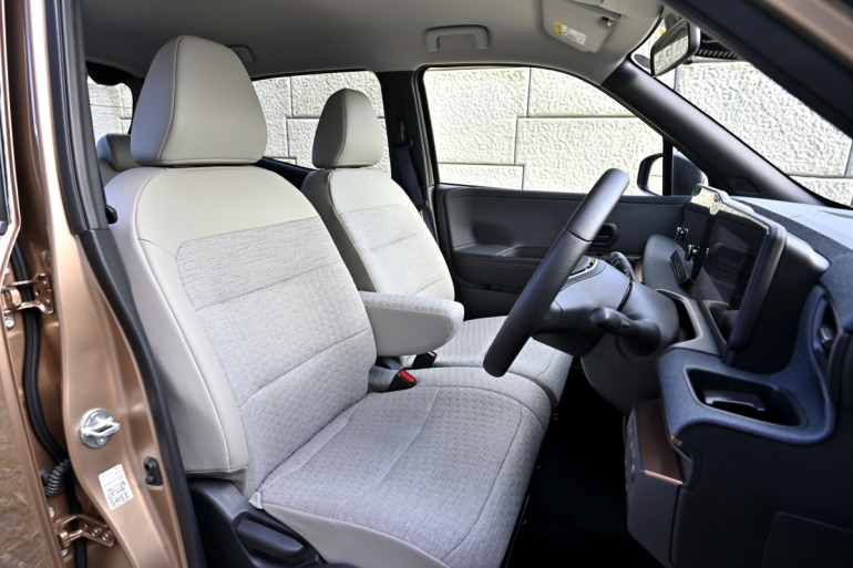 首都高速道路から東関東自動車道に入っても、車内は快適そのもの。前席はゼログラビティシートと呼ばれるもので、無重力空間をヒントに設計したというロングドライブでも「疲れないシート」で、ソファ感あるゆったりとしたかけ心地にも大満足。そしてドシリとした安定感、フラットで落ち着き感ある上質な乗り心地、これまでの軽自動車、エンジン車の常識を覆す車内の静かさ、そして圧巻の動力性能にはもう感動するしかありません。何しろモーターのスペックは64ps、19・9kg-m。最高出力は軽自動車のターボモデル同様の自主規制値上限値ですが、アクセルペダルを踏みこむと瞬時にレスポンスしてくれるトルクはなんと軽ターボの倍近い、2Lガソリン車並みの大トルクなのですから!!