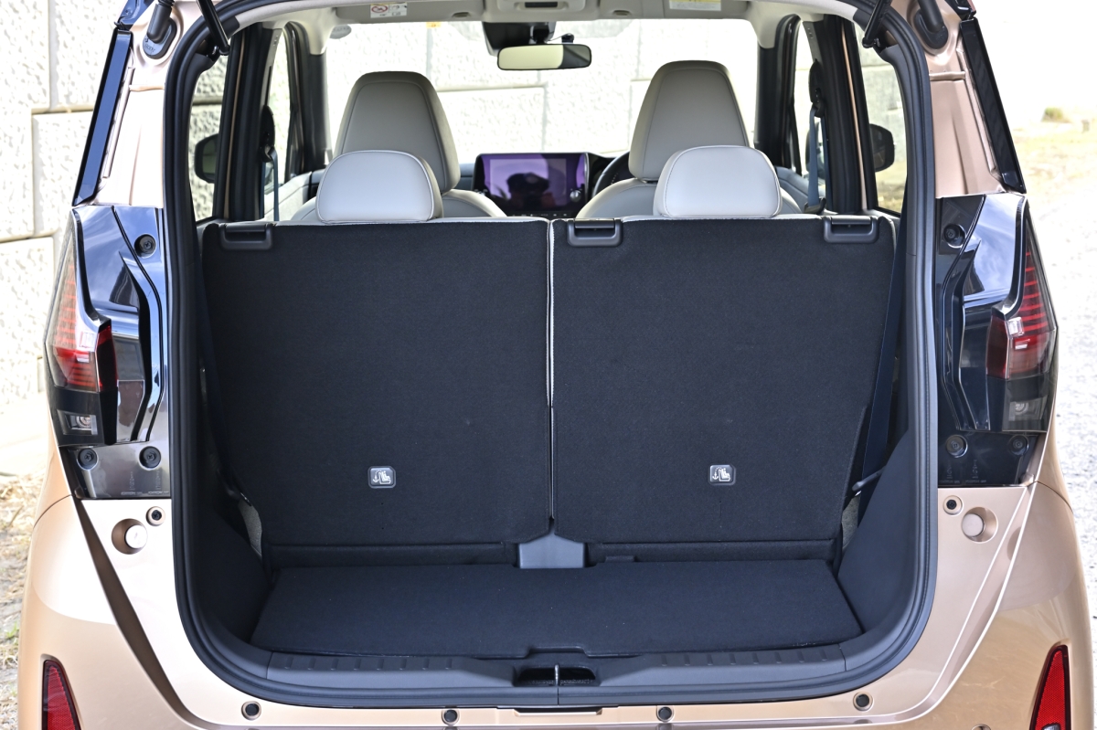 荷物はどうしたかと言えば、「サクラ」の後席が170mm前後にスライドするところがポイントで、あえて後席を前端にスライド。そのほうがDOG DEPTのドライブベッドなどの犬の乗車アクセサリーをより安定して設置できるのです(さらに安定するように足元にクーラーボックスを置いています)。すると、後席スライド位置最後端でのラゲッジルームの奥行きが385mmから540mm(実測)にまで拡大。幅方向は最大1105mm(最小部分でも870mm)もあり、機内持ち込みサイズのキャリーケースふたつを縦置きして積み込んでもまだまだ横方向にスペースがあり、そこにララ用の荷物を置くことができました。これなら軽自動車サイズの電気自動車ながら、2名+犬の2-3泊程度のドライブ旅行の荷物の積載もまったく問題ないでしょう。