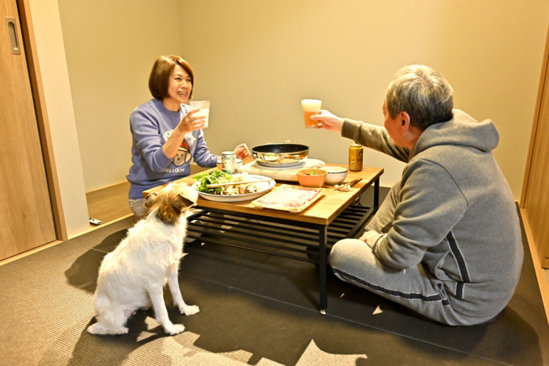 お部屋でまったりし、備え付けのコーヒーメーカーで淹れたコーヒーをいただき、夕方、片貝海岸でララを散歩させた後は、いよいよ今日のハイライト!? 誰にもジャマされない家族団らん、ララ無礼講!?の夕食タイムです。