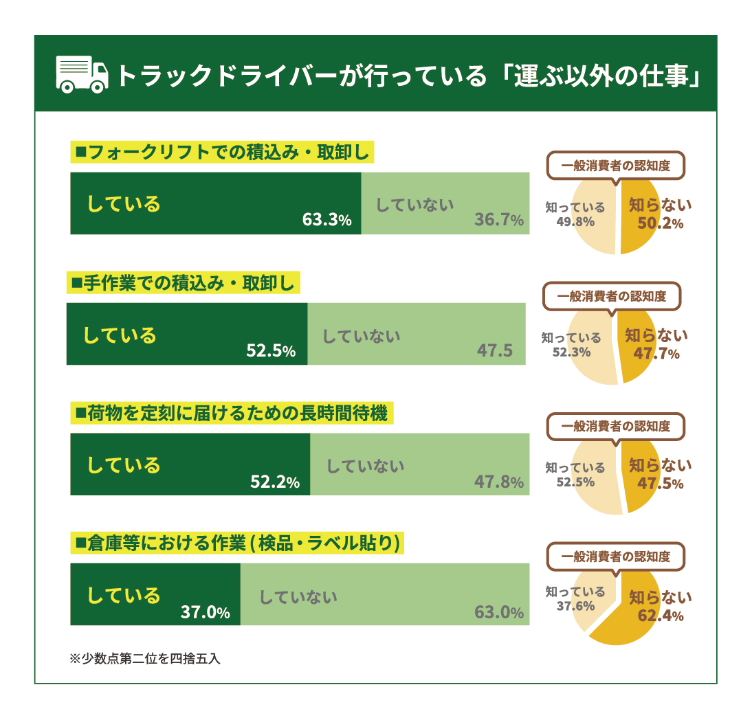 また、トラックドライバーの「運ぶ以外の仕事」に関して、一般消費者の半数近くが認知していないことが明らかに。