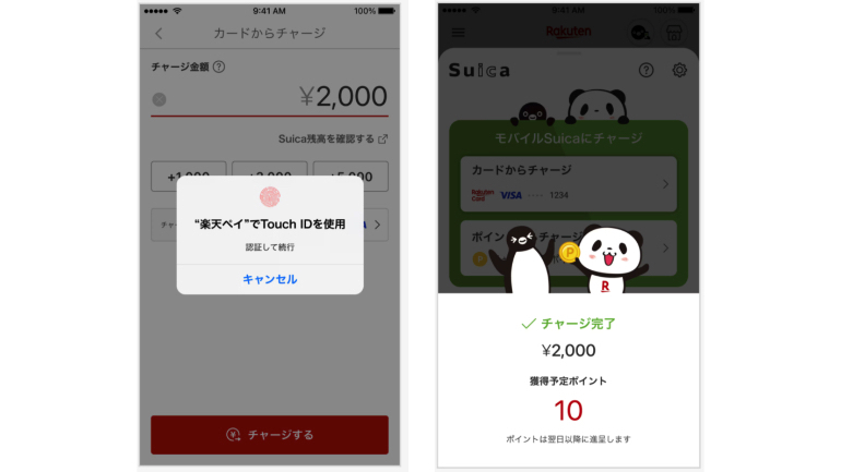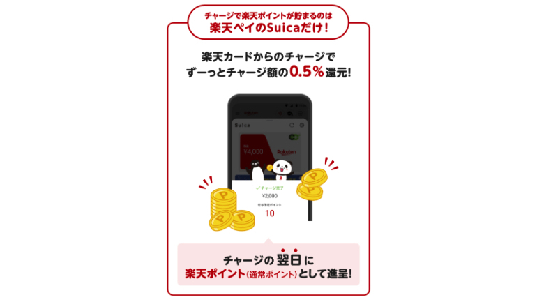 楽天ペイにモバイルSuicaを登録し、楽天カードからチャージすると、チャージ額の0.5%が楽天ポイントとして還元されます。楽天ポイントは、チャージした翌日に、通常ポイントとして進呈されます。