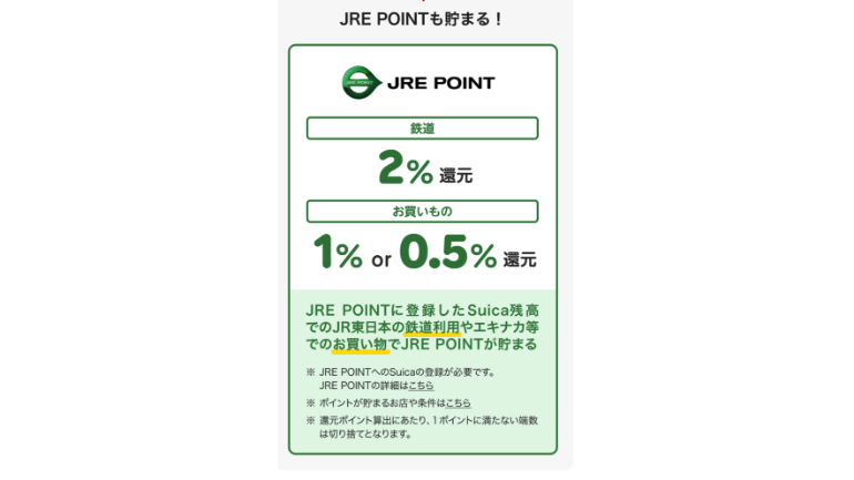 また、モバイルSuicaをJRE POINTにも登録しておけば、鉄道利用で2%、お買い物での利用で1%もしくは0.5%分のJRE POINTが還元されます。