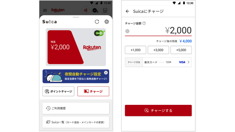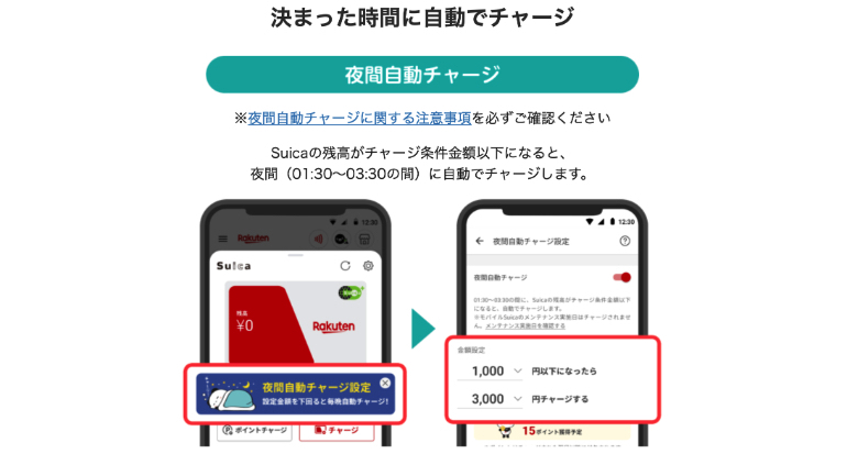 楽天ペイに登録したモバイルSuicaは、残高が自分で設定したチャージ条件金額以下になった際に、夜間(1:30〜3:30)に自動的にチャージされる「夜間自動チャージ」機能が利用できます。