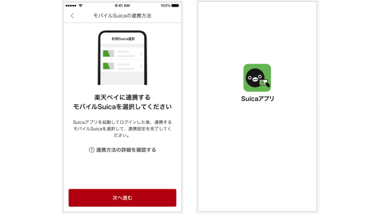 2.「次へ進む」をタップ。楽天ペイに連携するモバイルSuicaを選択すればOKです。