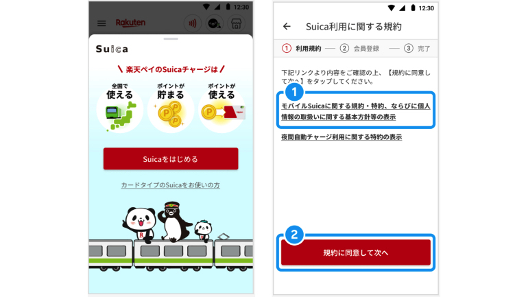 2.「Suicaをはじめる」をタップ。利用規約を確認の上、「規約に同意して次へ」をタップします。