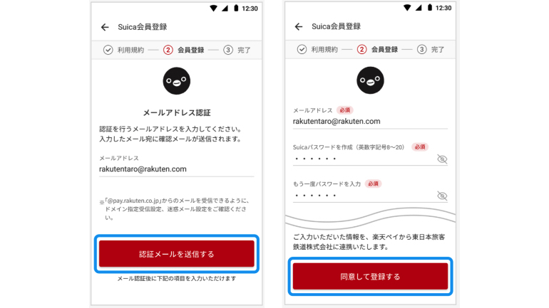 3.Suicaの会員登録に利用するメールアドレスを入力し、「認証メールを送信する」をタップ。そのまま会員登録を進めれば、モバイルSuicaの設定が完了します。
