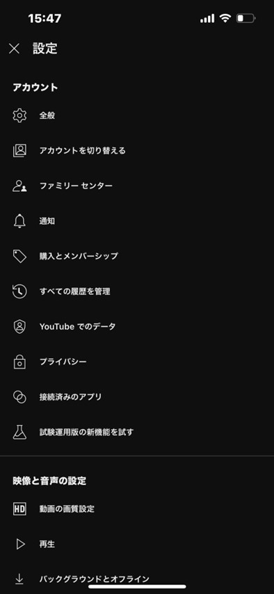 1.YouTubeアプリのアカウントアイコン>「設定」に進む