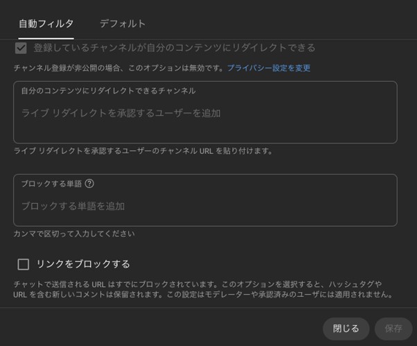 チャンネル運営者が「リンクをブロックする」部分にチェックを入れている場合、該当するコメントは審査待ちの状態になるため、自分のコメントが表示されない場合URLやハッシュタグが含まれていないかチェックしてみるのも良いだろう。