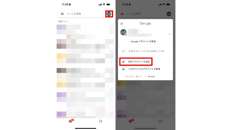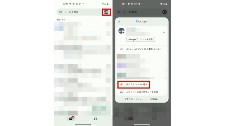 [①]Gmailアプリを開いて、右上のプロフィールをタップ。〝別のアカウントを追加〟を選びます。