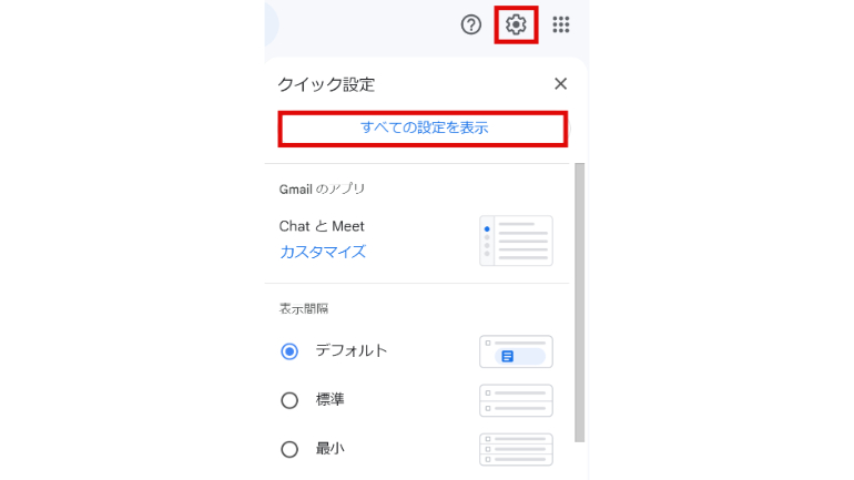 1.ブラウザでGmailを開いて設定(歯車マーク)をクリック。〝すべての設定を表示〟を選びます。