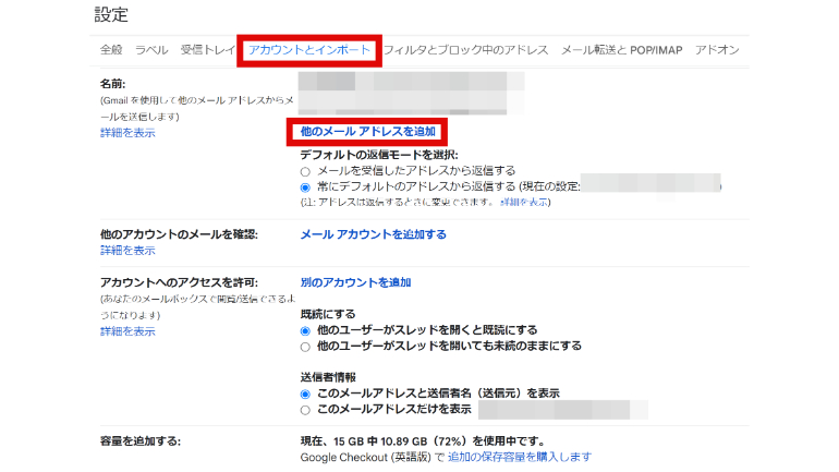 2.〝アカウントとインポート〟のタブ→〝他のメールアドレスを追加〟をクリック。