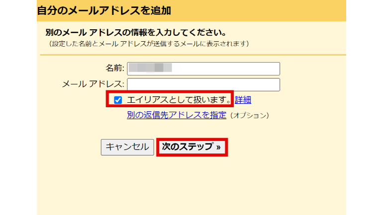 〝エイリアスとして扱います〟チェックを入れて、〝次のステップ〟をクリックします。