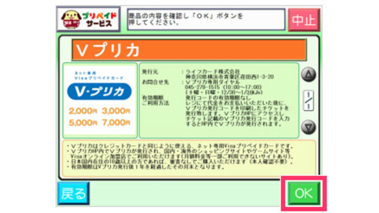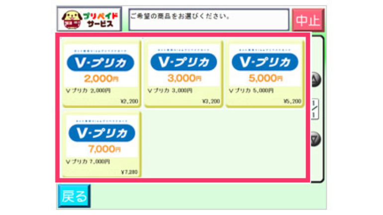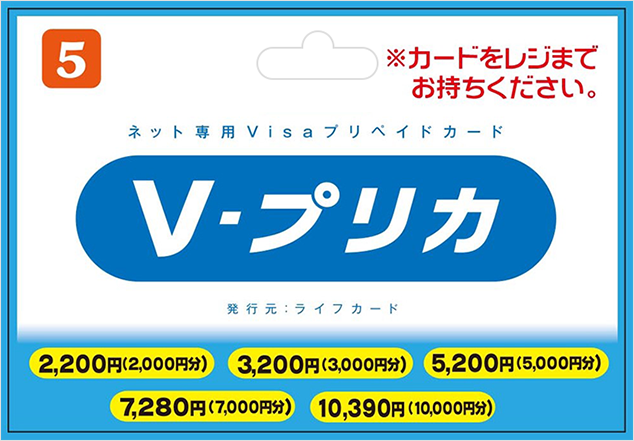 [1]店頭にて販売されている「Vプリカ」のサンプルカードをレジへ持って行き、購入したいチャージ金額を店員へ伝えてチャージコードの代金を支払います。