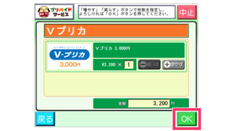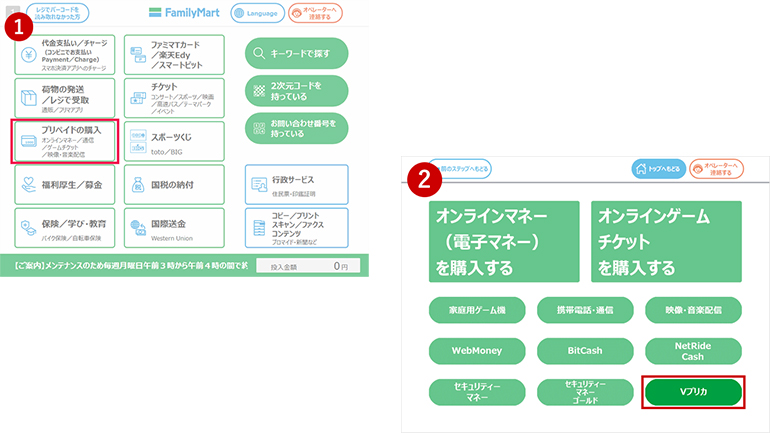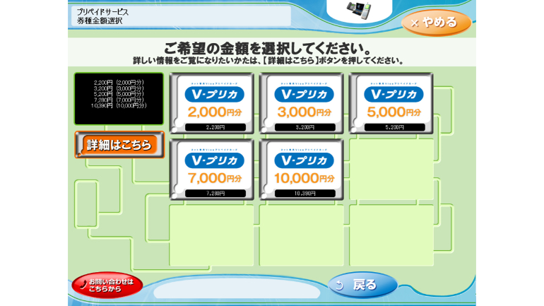 [1]マルチコピー機のメニューの〝プリペイドの購入〟→〝オンラインマネー(電子マネー)〟→〝Vプリカ〟の順番で選びます。