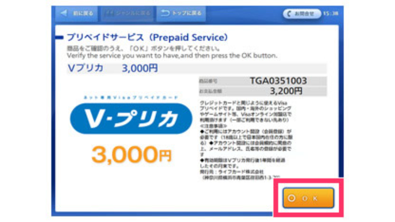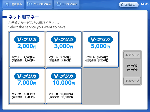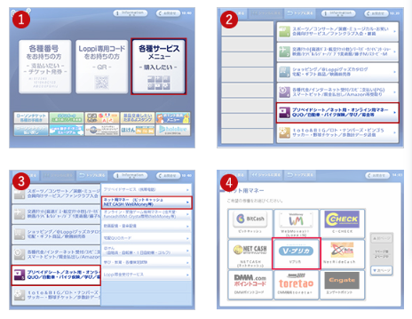 [1]Loppiのメニュー〝各種サービスメニュー〟→〝プリペイドシート/ネットマネー〟→〝ネット用マネー〟→〝Vプリカ〟の順番で画面をタッチします。