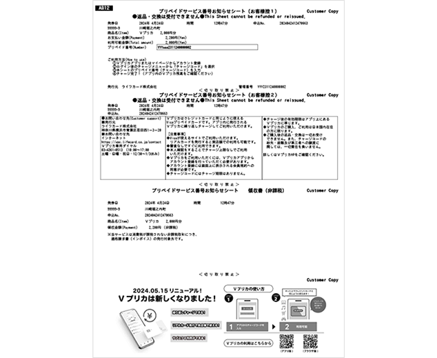 コンビニの端末などで発行されるチャージコードを使ってVプリカにチャージが可能です。